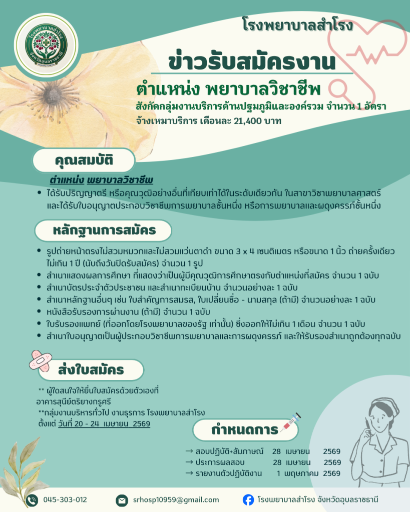 ประกาศรับสมัครงาน ตำแหน่ง พยาบาลวิชาชีพ จำนวน 1 อัตรา