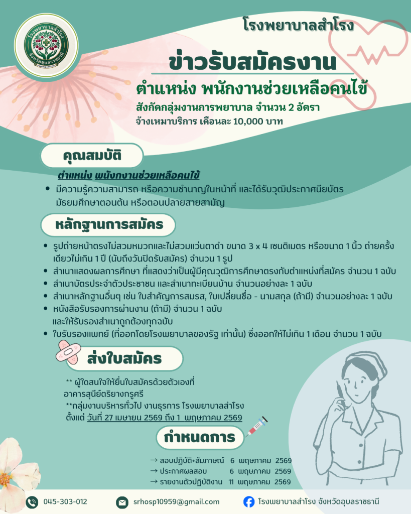 ประกาศรับสมัครงาน ตำแหน่ง พนักงานช่วยเหลือคนไข้ จำนวน 2 อัตรา